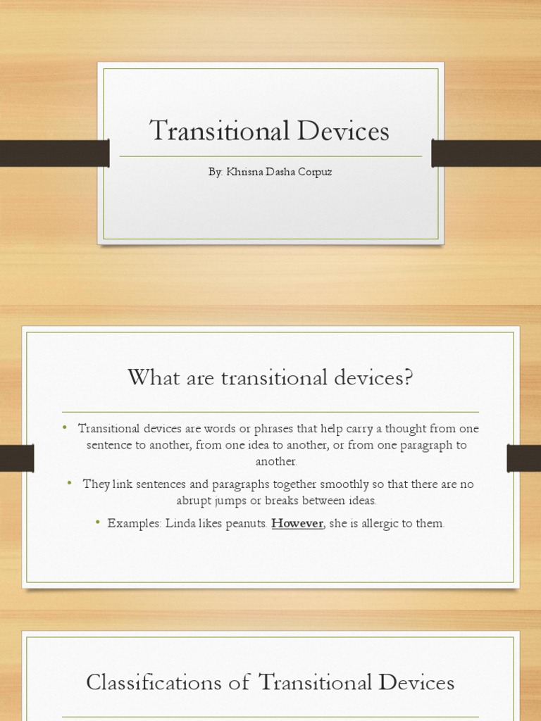 23+ Transitional Devices For Example Laredo TX. There are two basic types of transitions, conjunctive adverbs and conjunctions. Another type of transition is called a referent.