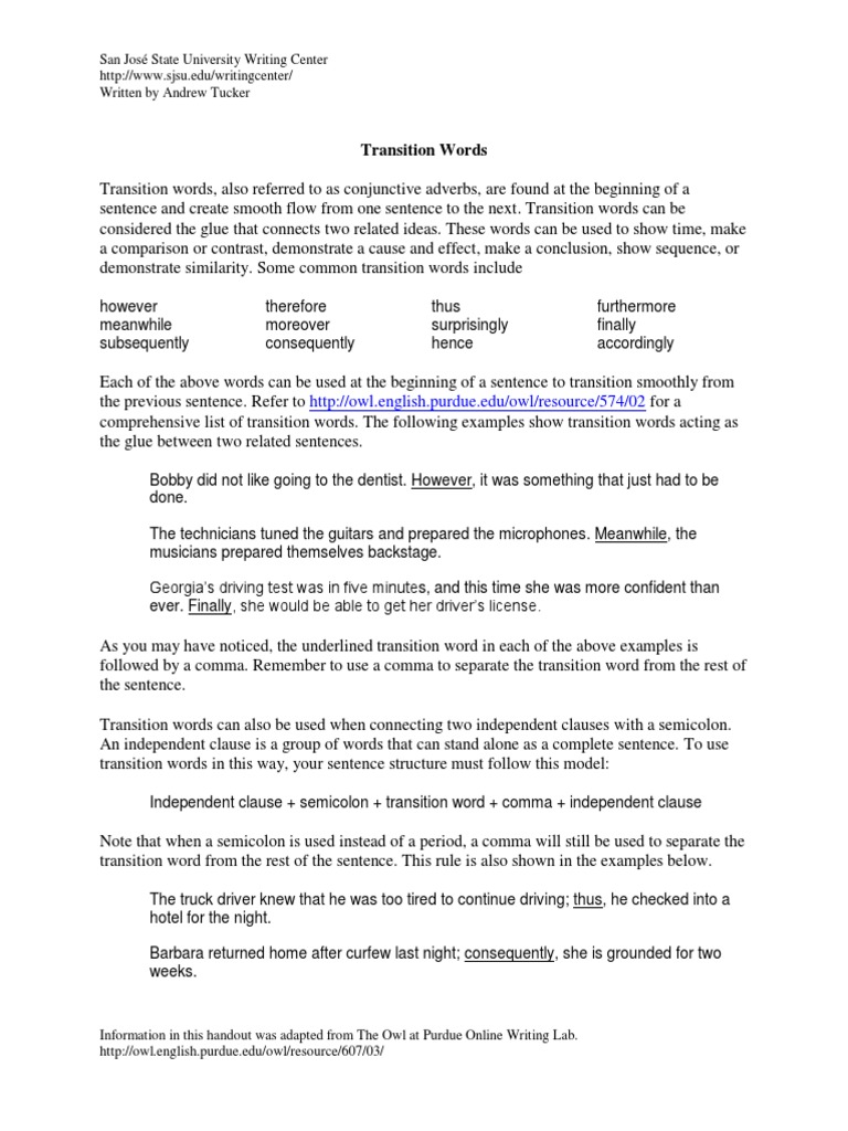 Before using a particular transitional word in your paper, be sure you understand its meaning and usage completely and be sure… Transition words are the glue that connect two separate ideas together. Transition words and phrases are used in order to organize the thoughts and ideas in a particular text. Transition words and phrases help make your essay flow smoothly from paragraph to paragraph.
